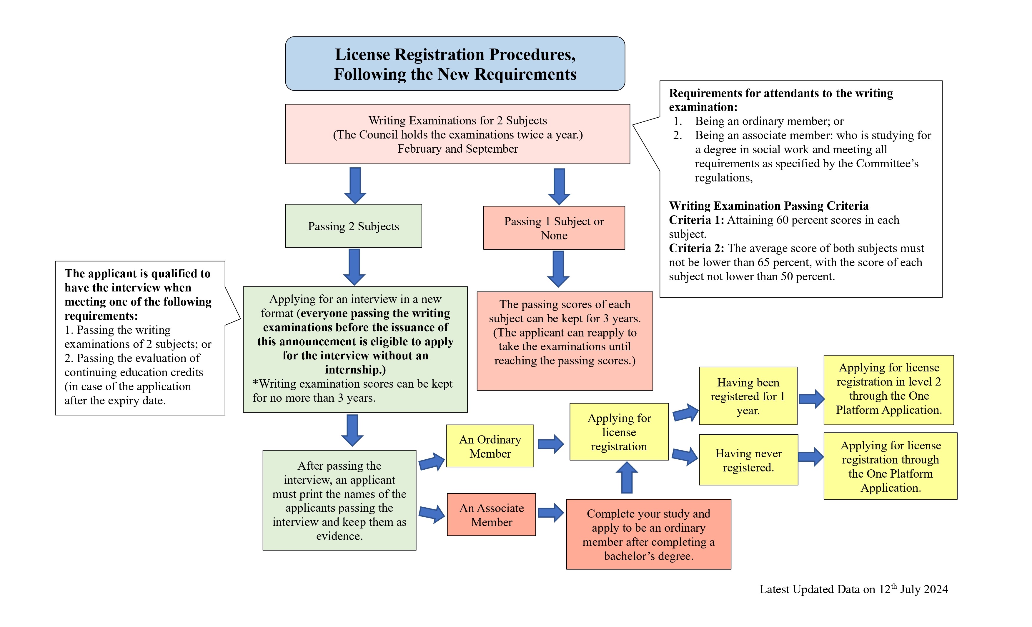 Applicant Requirements for License Registration 1. Being an ordinary member; 2. Passing the 2 subjects of the writing examinations (the examinations are held twice a year on the last Saturday of February and September); and 3. Pass the interview evaluation. The interviews are held 3 times a year. You can follow up on the news from the Facebook page of the Social Work Professions Council.